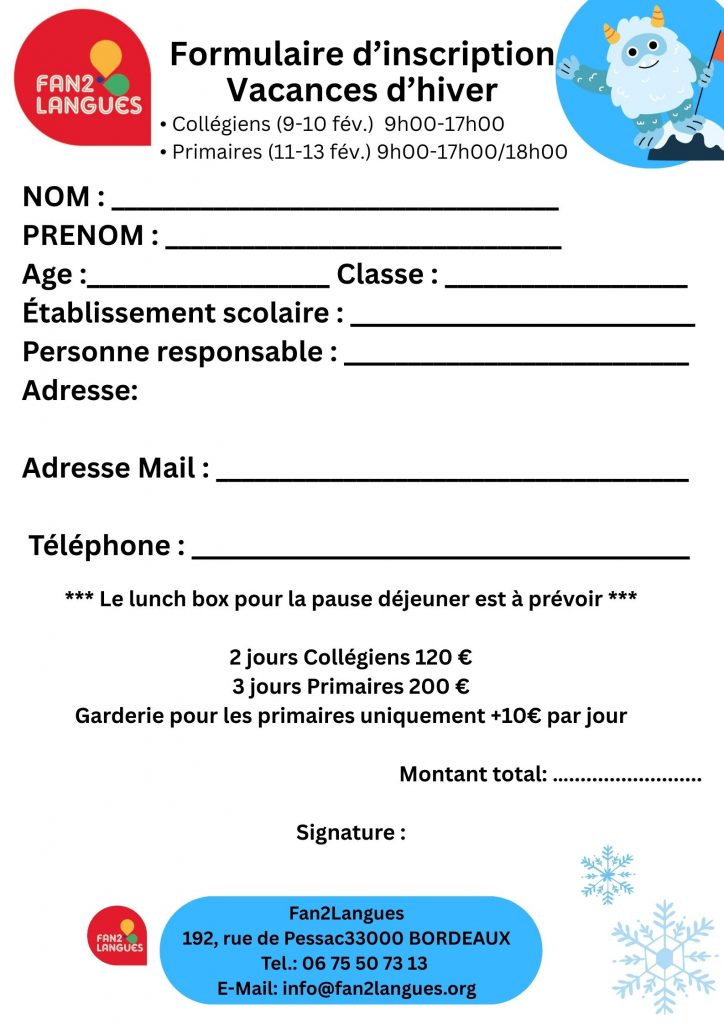 Pour vous inscrire, veuillez remplir le formulaire et nous le faire parvenir avec le paiement.